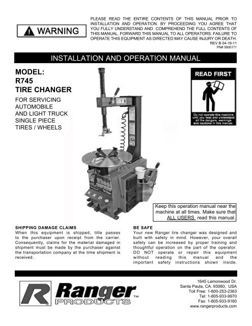 Ranger Wheel Guardian Rv1 Tyre Changer Installation And Operation Manual Manualslib